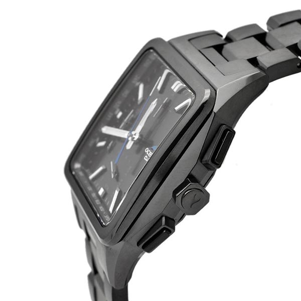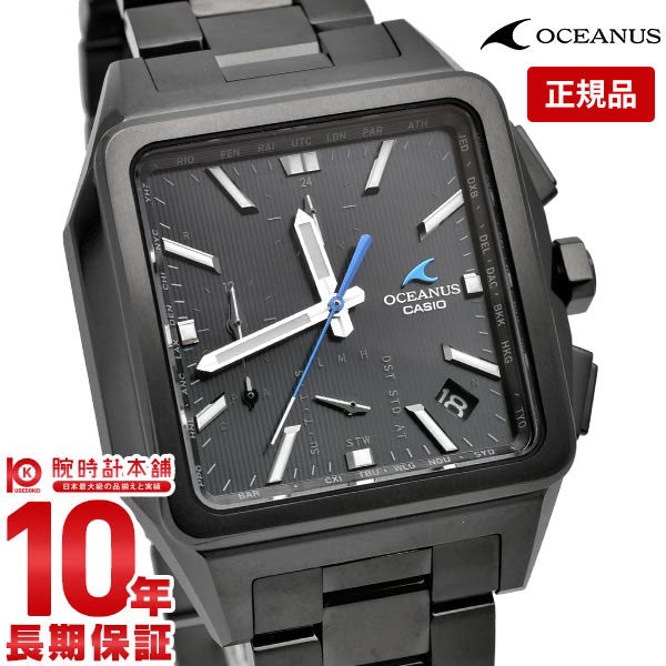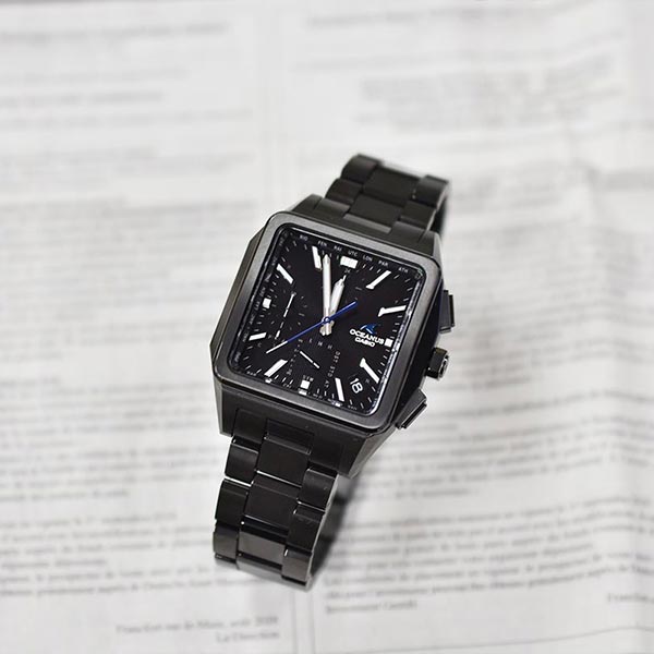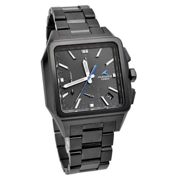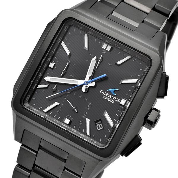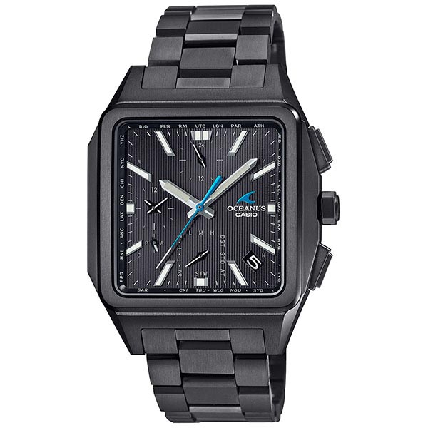 “Elegance, Technology”をブランドコンセプトに、先進のテクノロジーとスポーティデザインを併せ持つOCEANUSのクラシックラインから、ソリッドなイメージの角型ケースが特徴的な電波ソーラーモデルです。耐摩耗性にすぐれるDLC加工を採用し、オールブラックで精悍に仕上げました。機能面では、標準電波受信機能による時計での時刻修正に加え、スマートフォンリンクによる時刻修正機能を搭載。世界中で正確な時刻を取得できます。ワールドタイムの時刻を約300都市から設定したり、自動でタイムゾーンやサマータイムの変更にも対応可能。また、デュアルダイアルワールドタイムを搭載し2都市の時刻を同時に見られます。 OCWT5000B1AJF