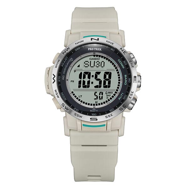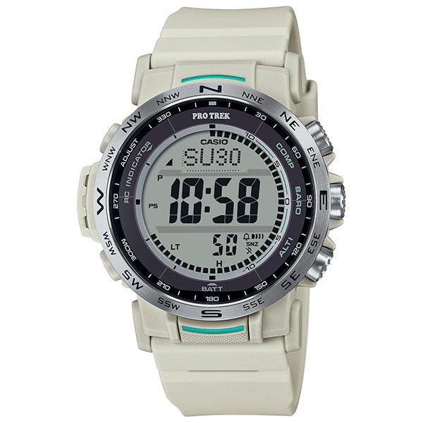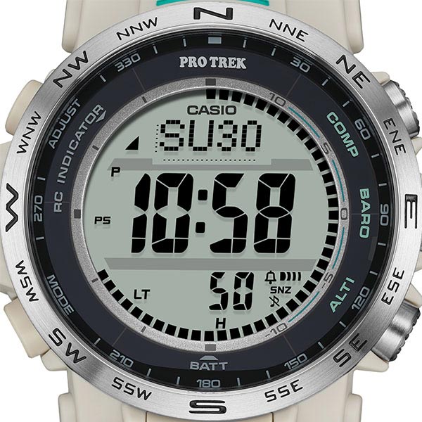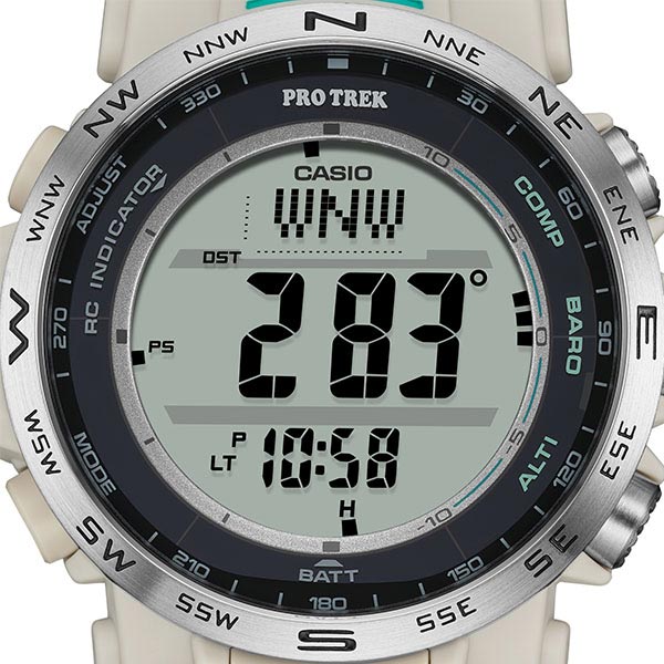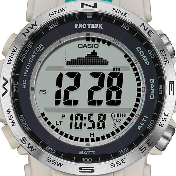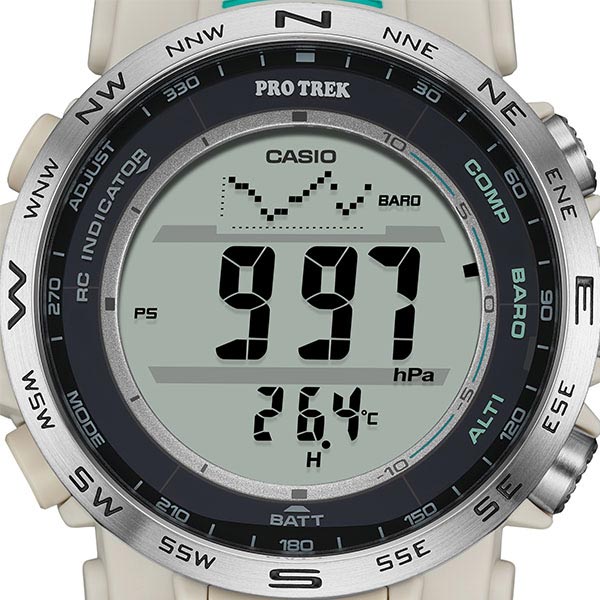 自然を愛する人の本格アウトドアギアPRO TREKクライマーライン。本モデルは環境に配慮されたエコ素材を採用し、直感的な操作が可能なデジタルウオッチです。ソフトウレタンバンドやケース、樹脂製の裏蓋にバイオマスプラスチックを使用。また、蒸れを防ぐスリット穴を設け腕への装着性を向上しました。大型のダイレクトボタンにより、方位、気圧/温度、高度をワンプッシュで直感的に計測、把握できます。また、STN液晶やボールドフォントを採用し、視認性を向上させています。計測機能に加えタフソーラーや電波受信機能、10気圧防水等の基本性能も搭載し、過酷なアウトドアシーンでも使用できます。 PRW357JF