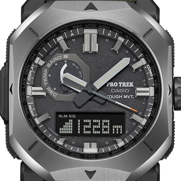 | 仕様 | ・タフソーラー(ソーラー充電システム) ・電波受信機能:自動受信(最大6回/日)(中国電波は最大5回/日)/手動受信、 <日本>受信電波:JJY、周波数:40kHz/60kHz(福島/九州両局対応モデル) <北米地域>受信電波:WWVB、周波数:60kHz <ヨーロッパ地域>受信電波:MSF/DCF77、周波数:60kHz/77.5kHz <中国>受信電波:BPC、周波数:68.5kHz *ホームタイム設定を受信可能な都市に設定すると、都市に合わせた局を受信します。尚、時差は選択した都市によって設定されます。 ・針位置自動補正機能 ・針退避機能(手動、自動(高度、気圧、温度計測時)) ・ワールドタイム:世界29都市(29タイムゾーン、サマータイム設定機能付き)+UTC(協定世界時)の時刻表示、ホームタイムの都市入替機能、UTCダイレクト呼出機能 ・方位計測機能:16方位・方位の角度(0~359°)を計測、方位連続計測(60秒)、北方位指針機能、磁気偏角補正機能、方位補正機能(2点補正) ・高度計測機能/相対高度計(計測範囲:-700~10,000m、1m単位)、高度差インジケーター(計測範囲1:100m/5m単位、計測範囲2:1,000m/50m単位)、高度傾向グラフ表示、計測間隔設定機能(5秒/2分)、高度メモリー(計測年月日・時刻・高度を最大30本マニュアルメモリー)、自動記録データ(最高/最低高度、オート積算(上昇/下降)メモリー) ・気圧計測機能(計測範囲:260~1,100hPa、1hPa単位)、気圧傾向グラフ表示(過去20時間分を表示)、気圧差インジケーター(計測範囲:±10hPa/1hPa単位)、気圧傾向インフォメーションアラーム(特徴的な気圧の変化が起こった場合に矢印と報音でお知らせします) ・温度計測機能(計測範囲:-10~60℃、0.1℃単位) ・ストップウオッチ(1/100秒、24時間計) ・タイマー(セット単位:1分、最大セット:60分、1秒単位で計測) ・時刻アラーム5本・時報 ・バッテリーインジケーター表示 ・パワーセービング機能(暗所では一定時間が経過すると表示を消して節電します) ・フルオートカレンダー ・12/24時間制表示切替 ・耐低温仕様(-10℃) ・操作音ON/OFF切替機能 ・ダブルLEDライト:文字板用LEDライト(フルオートライト、スーパーイルミネーター、残照機能、残照時間切替(1.5秒/3秒)付き)、LCD部用LEDバックライト(フルオートライト、スーパーイルミネーター、残照機能、残照時間切替(1.5秒/3秒)付き) |