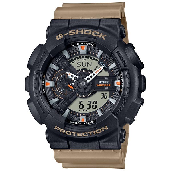 1983年の発売以来、飽くなき強さを求めて進化を続けるタフネスウオッチG-SHOCKから、ブラックのケースにカーキやオリーブグリーンといった人気のカラーを採用した、Two tone utility colorsです。ブラックのケースに人気の高いカーキやオリーブグリーンのバンドを採用し、ダイアルまわりにオレンジやイエローといった差し色を使って、ラギッドな中にもスタイリッシュに仕上げました。 GA110TU1A5JF