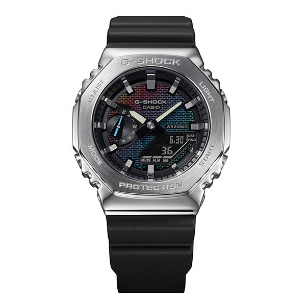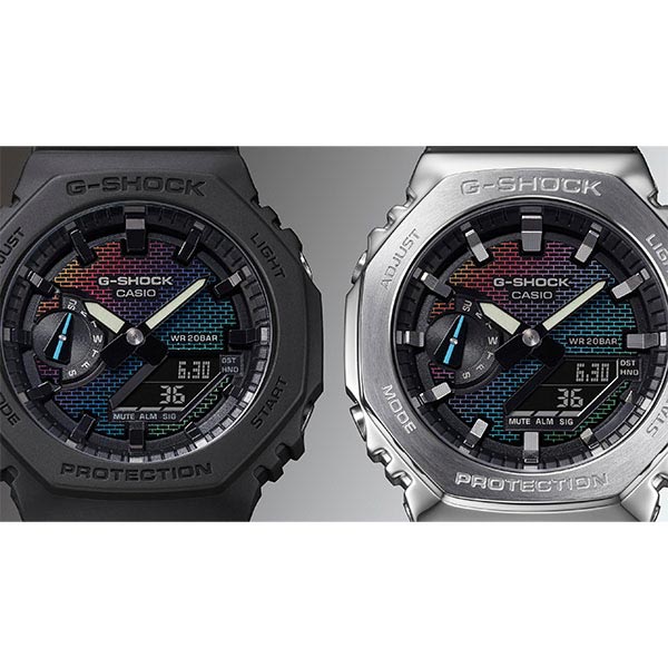 1983年の発売以来、飽くなき強さを求めて進化を続けるタフネスウオッチG-SHOCKから、ガラス板、文字板に蒸着を施したモデルです。G-SHOCKのアイコニックなデザインであるレンガパターンを光の反射によりさまざまな色合いを見せるレインボーカラーで表現。壁を乗り越えて、常に限界を超えて挑戦していくタフネススピリットを表現しました。ベースモデルには、アイコニックなG-SHOCKの定番の5600シリーズとオクタゴンベゼルの2100シリーズを採用し、G-SHOCKの初号機にも使用されているレンガパターンを印刷しました。 GM2100RW1AJF
