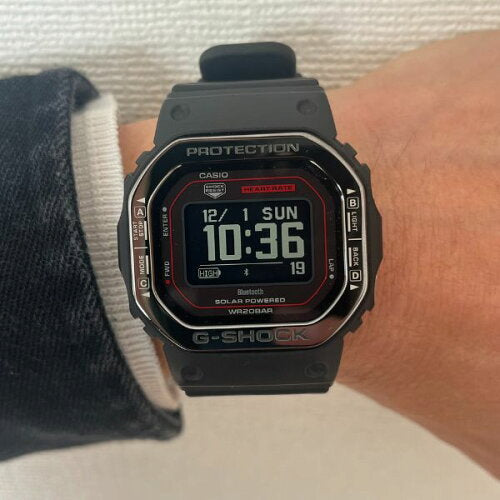 タフネスを追求するG-SHOCKのスポーツライン「G-SQUAD」に日常生活で活躍するDW-H5600シリーズの追加カラーです。メタル製のトップベゼルに機能表記をレーザー刻印し、スポーツシーンでのハイテクギア感を演出しています。ブラックのカラーリングにレッドのアクセントでG-SHOCKのブランドカラーを採用したモデルになっています。バンドにはバイオマスプラスチックを採用し、環境負荷低減に貢献することが期待されています。ベースモデルのDW-H5600と同様、ワークアウトに役立つ機能として、心拍計測が可能な光学式センサー、歩数計測が可能な加速度センサーを搭載。ランニング、ウォーキングやワークアウトに対応しています。また、ポラール社アルゴリズムによるトレーニング解析、睡眠による回復度の解析、呼吸エクササイズ等が可能です。血中酸素レベル計測機能も搭載しています DWH5600MB1A4JR