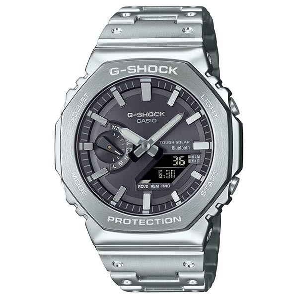 G-SHOCK初代モデル“DW-5000C”のコンセプトを受け継いで開発されたアナログ「2100」シリーズのフルメタルモデルです。スクリューバックケース、ベゼル、バンドにステンレススチールを採用し、落下時の衝撃からモジュールを守る耐衝撃構造をとりながらも、無駄を省いたシンプルなデザインを目指しました。1983年に誕生したDW-5000Cにも採用された八角形のベゼル形状や、バンドのディンプルデザインも継承しています。 GMB2100SD1AJF