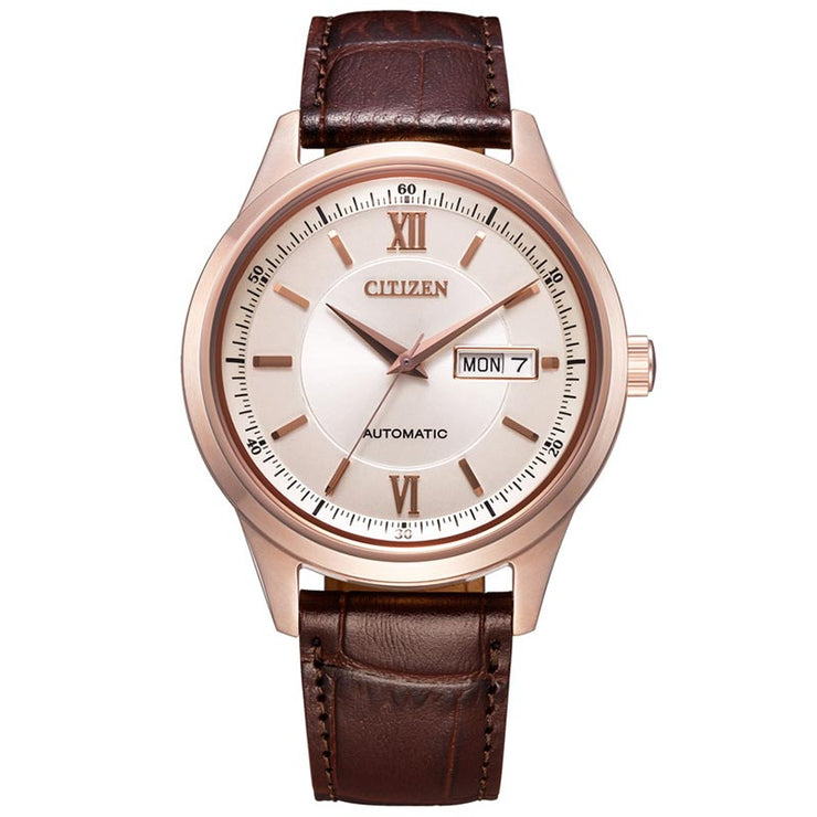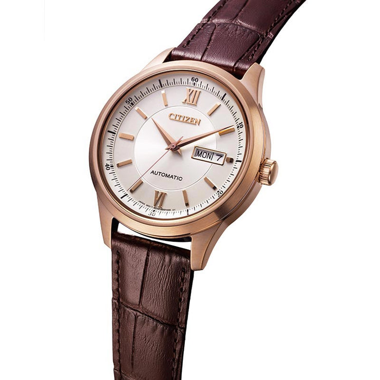 クラシカルなテイストが人気のメカニカル3 針モデルに革バンド仕様が登場。クラシカルな印象がよりいっそう際立ちます。文字板は、視認性に優れたシンプルなデザイン。日付と曜日がすぐ確認できる便利なデイ&デイト機能がついています。裏ぶたは、回転する錘(おもり)とメカの動きを楽しめるシースルーバックを採用しています。