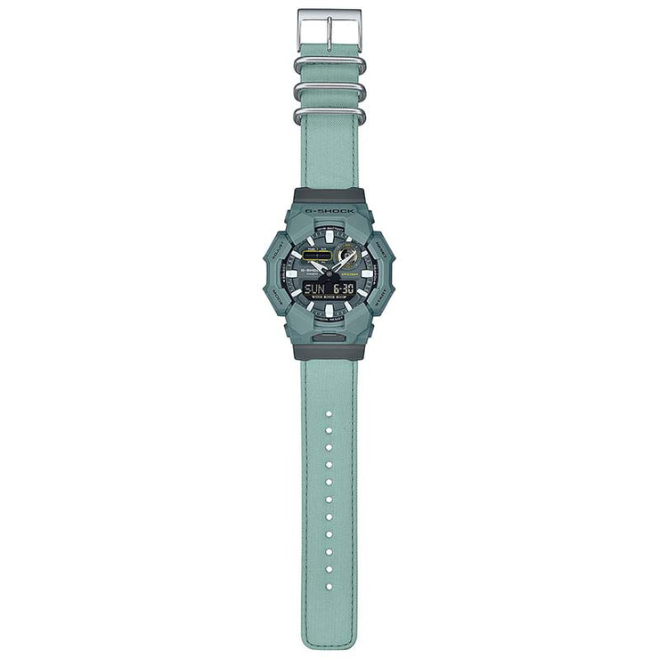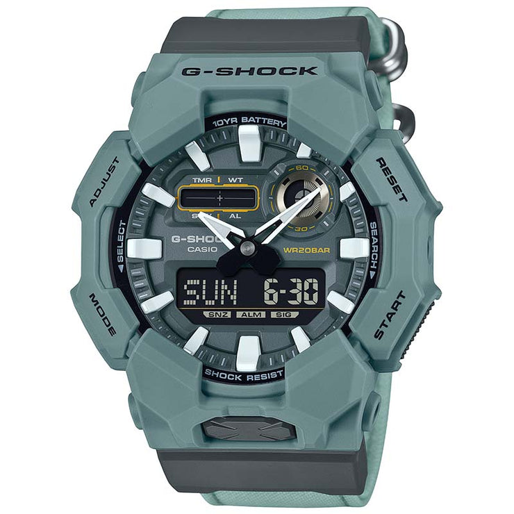 1983年の発売以来、飽くなき強さを求めて進化を続けるタフネスウオッチG-SHOCKの10年バッテリーBig caseシリーズから、自然志向のライフスタイルを彩るモデルのご紹介です。ハードな使用に耐える耐衝撃性能と、長く使える電池寿命約10年を同時に実現したGA-010、GD-010。主な樹脂パーツにバイオマスプラスチックを使用し、環境負荷低減に貢献することが期待されています。また、バンドの素材には、耐久性に優れコーデュラ糸と再生PETのリサイクル糸を使用する「CORDURA re/cor」を使用。着色には、「FOOD TEXTILE」の染色手法を採用。エキナセア(GD-010CE)と赤かぶ(GA-010CE)から抽出した染料で、天然由来の優しい色合いに仕上げました。カジュアルスタイルからワークスタイルまでアクセントになるクールなデザインです。 GA010CE2AJF