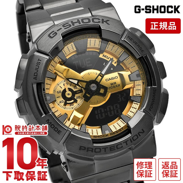 1983年の発売以来、究極の強さを求めて進化を続けるタフネスウオッチG-SHOCK。そのアイコニックなスタイルで人気モデルのひとつであるビッグケースのアナログ・デジタルコンビネーション、「110シリーズ」のベゼルとバンドを金属素材にアップデートしたGM-110です。緻密な鍛造工程を経て、切断と研磨だけでなく、特殊な成形による金属製ベゼルを採用し、タフな構造はそのままに無骨で存在感のあるデザインに仕上げました。ケース素材には、高剛性を発揮するカーボン繊維入りファインレジンを使用し、新たにデザインされたメタルバンドで、幅広いストリートシーンにも対応できる仕様になっています。ブラックIP塗装でオールブラックにゴールドのダイアルが輝くGM-110BD-1A9と、シルバーステンレスにガンメタリックのダイアルでシーンを選ばないGM-110D-8Aの2モデルをラインアップ。G-SHOCKビッグケースの存在感と、デザイン、フォルム、サイズ、さらに耐衝撃性能に徹底的にこだわった、GM-110です。 GM110BD1A9JF