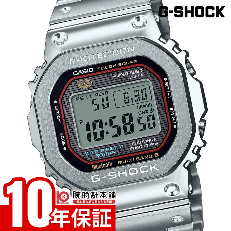 1983年に誕生したG-SHOCK初代モデル“DW-5000C”のダイアルカラーを纏ったフルメタルモデルです。G-SHOCKのブランドカラーでもあり挑戦し続ける情熱を意味するレッド、高い防水性を表すブルー、ショックレジスタントを意味するイエローをあしらっています。ステンレススチール製のベゼルは、手間のかかる鍛造・切削・研磨加工を経て、立体的に成形し、天面をヘアライン、斜面をミラー研磨で美しく仕上げています。ステンレススチール製のケースは初代モデルと同じく、気密性に優れたスクリューバックケースを採用しています。フルメタルによる耐衝撃構造を実現するために、ベゼルとケースの間にはファインレジン製の緩衝材を実装。また、バンド接続部を3本足構造とし、連結パイプに加わる衝撃を分散。メタル製のバンドピースにディンプル加工を施し、初号機の樹脂バンドデザインを継承しました。製造も初代G-SHOCKを生み出したマザーファクトリー「 山 形カシオ 」で行 っています。