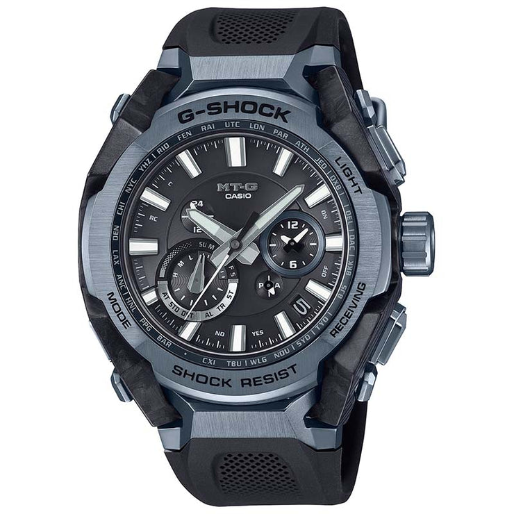 G-SHOCKの起源である樹脂素材とメタル素材を融合して、革新的な構造美を追求するMT-Gシリーズ。MTG-B4000は、蓄積された耐衝撃データを活用したAIによって開発された新しいデュアルコアガード構造と、カーボンとステンレススチールの異素材融合フレームを採用しています。これにより、強さと美しさを兼ね備えた革新的なデザインが実現しました。AIと人の共創により、素材、構造、造形が有機的に結合し、独創的な機能美を追求しています。AIを活用した開発プロセスでは、デザイナーのベース案の解析・シミュレーションの最適化をAIが行い、これを相互補完的に繰り返すことで機能性と美しさを両立させた形状を実現しました。カーボン積層フレームは、シート状のカーボンとグラスファイバーを積層した母材を立体状に削り出し、複雑造形のフレームを成形。ベゼルのステンレススチールパーツは内側と外側で2体ベゼルを採用。ヘアライン仕上げとミラー仕上げで部位ごとに磨き分け、美しく仕上げました。耐衝撃構造、耐遠心重力性能、耐振動構造をもつTRIPLE G RESISTも実現。裏蓋は、粉末状の金属を射出成形するMIM(メタルインジェクションモールディング)成形により立体的に成形され、ケースを保護しています。MTG-B4000B-1A2には、ベゼルなどのステンレススチールパーツに新開発のブルーグレーのIP加工を施しています。また、透明度の高いサファイアガラスを採用し、カシオ山形工場の微細加工技術による繊細なデザインが施されたダイアルなど、細部にまでこだわりました。機能面ではBluetooth? 通信機能により専用アプリ「CASIO WATCHES」と接続し時刻情報を取得。マルチバンド6やタフソーラー、高輝度なLEDライトも搭載し、実用的な機能を備えています。