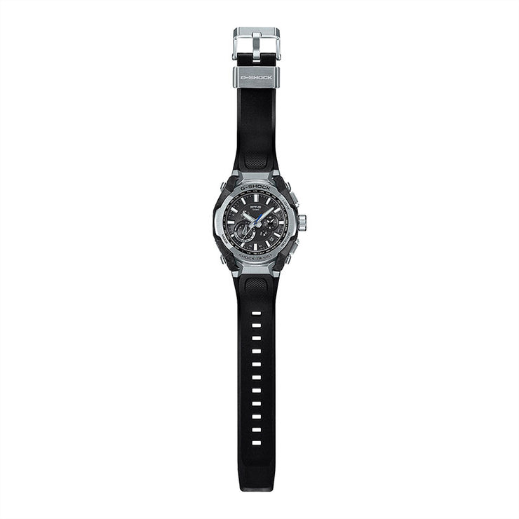 G-SHOCKの起源である樹脂素材とメタル素材を融合して、革新的な構造美を追求するMT-Gシリーズ。MTG-B4000は、蓄積された耐衝撃データを活用したAIによって開発された新しいデュアルコアガード構造と、カーボンとステンレススチールの異素材融合フレームを採用しています。これにより、強さと美しさを兼ね備えた革新的なデザインが実現しました。AIと人の共創により、素材、構造、造形が有機的に結合し、独創的な機能美を追求しています。AIを活用した開発プロセスでは、デザイナーのベース案の解析・シミュレーションの最適化をAIが行い、これを相互補完的に繰り返すことで機能性と美しさを両立させた形状を実現しました。カーボン積層フレームは、シート状のカーボンとグラスファイバーを積層した母材を立体状に削り出し、複雑造形のフレームを成形。ベゼルのステンレススチールパーツは内側と外側で2体ベゼルを採用。ヘアライン仕上げとミラー仕上げで部位ごとに磨き分け、美しく仕上げました。耐衝撃構造、耐遠心重力性能、耐振動構造をもつTRIPLE G RESISTも実現。裏蓋は、粉末状の金属を射出成形するMIM(メタルインジェクションモールディング)成形により立体的に成形され、ケースを保護しています。MTG-B4000B-1A2には、ベゼルなどのステンレススチールパーツに新開発のブルーグレーのIP加工を施しています。また、透明度の高いサファイアガラスを採用し、カシオ山形工場の微細加工技術による繊細なデザインが施されたダイアルなど、細部にまでこだわりました。機能面ではBluetooth? 通信機能により専用アプリ「CASIO WATCHES」と接続し時刻情報を取得。マルチバンド6やタフソーラー、高輝度なLEDライトも搭載し、実用的な機能を備えています。