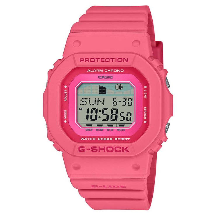 TEAM G-SHOCKのプロサーファ―、ベティルー・サクラ・ジョンソンがハワイ・オアフ島出身であることから、ハワイの花々をイメージしたG-LIDEの新色モデルです。ハワイアンキルトでよく使われるブルージェイドバインを思わせる深いブルーと、ハワイに咲くカンヒザクラをイメージした魅惑的なピンクの2色展開で、夏の陽射しに映える鮮やかなカラーリングです。サーフシーンに一層の華やかさを添えます。液晶外周部には金属文字板(BS文字板)を採用。全体的に一色でまとめながら、色の濃淡をつけたりメタルの質感を加えることで、シンプルながらも個性的なモデルになっています。機能面ではサーファー必須の機能であるタイドグラフとムーンデータも備え、世界中の海でのライディングをサポートします。ベゼル、バンドの主な樹脂パーツにバイオマスプラスチックを採用。原料に再生可能な有機資源を使うことで、環境負荷低減への貢献が期待されています。サーフシーンと強い結びつきを持つネイチャー、クリーン、エシカルなイメージを、G-SHOCKらしいデザインとカラーでカタチにしました。