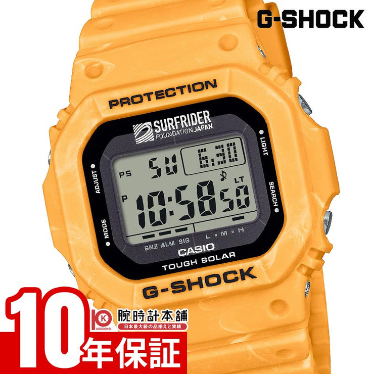 世界のトップサーファーをはじめ、エクストリーム系スポーツをサポートしているG-SHOCKと、海を愛するサーファーとともに環境保護活動を続ける「サーフライダーファウンデーションジャパン」とのコラボレーションモデルです。「サンライズサーフ」をテーマに、心地よい朝日を浴びて美しく輝くビーチの情景を、イエローとライトイエローのミックスカラーの混色成形で表現。環境負荷低減に貢献することが期待されている、バイオマスプラスチックやタフソーラーを採用しています。フェイス部と裏蓋にSURFRIDER FOUNDATION JAPANのロゴをあしらい、遊環に「#oceanfriendlylifestyle」のタグラインをプリント。海や自然との共生をいつも身近に感じられるデザインに仕上げました。