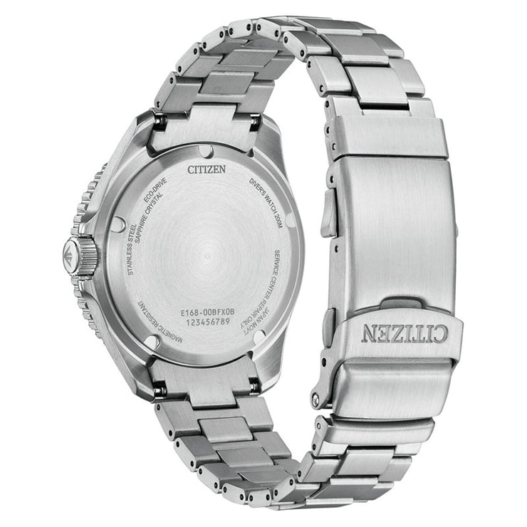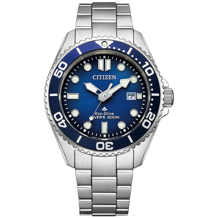 機能性、耐久性、安全性を兼ね備えた本格スポーツウオッチ、シチズン PROMASTER(プロマスター)。 コンパクトなサイズ感と正統派のデザインにこだわった、エコ・ドライブ ダイバー200mモデルが登場。 ・腕元になじみやすい40.6mmのケースを採用した正統派のデザイン。ダイバーズウオッチを初めて手にする方にもおすすめの1本です。 ・回転ベゼルの外周全体に、やや深めの溝を刻んだオーソドックスな仕上がり。優れた操作性も実現しています。 ・3連メタルバンドは、別体構造の中駒を用い、斜面をミラー仕上げにした立体感のある力強いデザイン。バックルは、ダイビングスーツを着用した際なども簡単に調整・装着できるラチェット付ダブルホールディングバックルを採用しています。 ・ブルー文字板は、中心から外側にかけてのグラデーションが、深く澄んだ海中を表現。シンプルながらも高級感のあるフェイスに仕上げています。