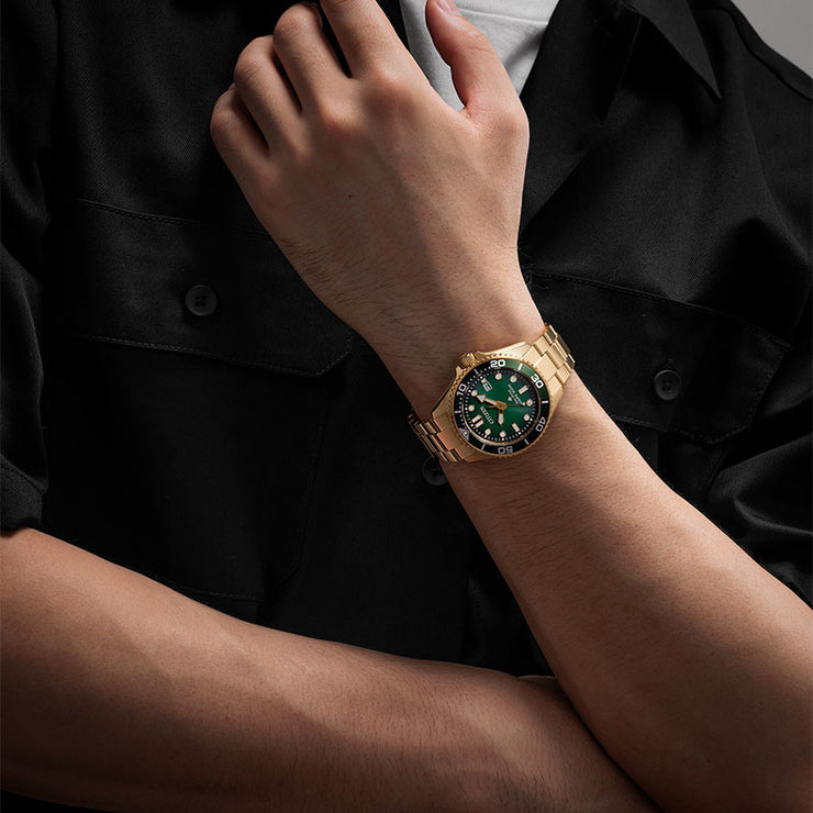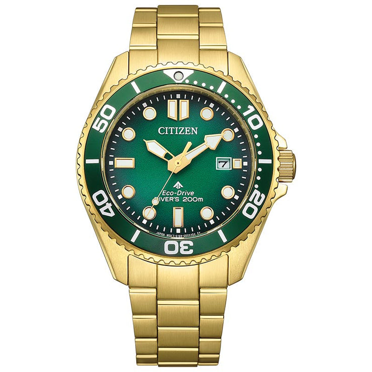 機能性、耐久性、安全性を兼ね備えた本格スポーツウオッチ、シチズン PROMASTER(プロマスター)。 コンパクトなサイズ感と正統派のデザインにこだわった、エコ・ドライブ ダイバー200mモデルが登場。 ・腕元になじみやすい40.6mmのケースを採用した正統派のデザイン。ダイバーズウオッチを初めて手にする方にもおすすめの1本です。 ・回転ベゼルの外周全体に、やや深めの溝を刻んだオーソドックスな仕上がり。優れた操作性も実現しています。 ・3連メタルバンドは、別体構造の中駒を用い、斜面をミラー仕上げにした立体感のある力強いデザイン。バックルは、ダイビングスーツを着用した際なども簡単に調整・装着できるラチェット付ダブルホールディングバックルを採用しています。 ・グリーン文字板は、中心から外側にかけてのグラデーションが、深く澄んだ海中を表現。シンプルながらも高級感のあるフェイスに仕上げています。