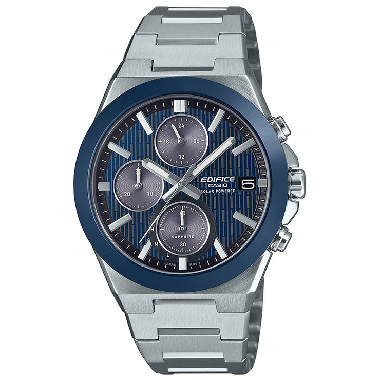 EDIFICEの新たな魅力を体現するこの腕時計は、モータースポーツファンや車好きの方に最適です。初採用のセラミックベゼルは、高級スポーツカーのような美しい艶感を持ち、ステンレススチールよりも傷に強く、その美しさを長期間保ちます。また、風防にはサファイアガラスを使用し、視認性と耐傷性を両立。ソーラーパワーによる長寿命駆動や、ストップウオッチ、10気圧防水機能も備えています。フラットなステンレススチールケースとバンドは、ヘアライン仕上げと鏡面仕上げで緻密にデザインされ、文字板には洗練されたパターンが施されています。40.9mmの小ぶりなケースサイズが、スタイリッシュかつ機能的なデザインを実現しています。