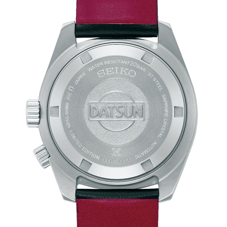 「ダットサン 240Z」サファリカーをイメージしたカラーリングを採用。 当時の「DATSUN」ロゴマークをダイヤル、ケースバック、バックルの3箇所にレイアウトしたコラボレーション限定モデルならではの特別仕様です。 内転リング式カウントダウンタイマー上のアラビア数字は、サファリカーの計器盤を参考にした判読性の高いオリジナルフォント。 裏ぶたには数量限定モデルの証であるLIMITED EDITIONおよび限定連番(No.0001/2500-2500/2500)を表記。 特別にデザインされたノベルティアイテムとして、商品ストーリーがデザインされた時計クロスが専用ボックスに同梱されます。