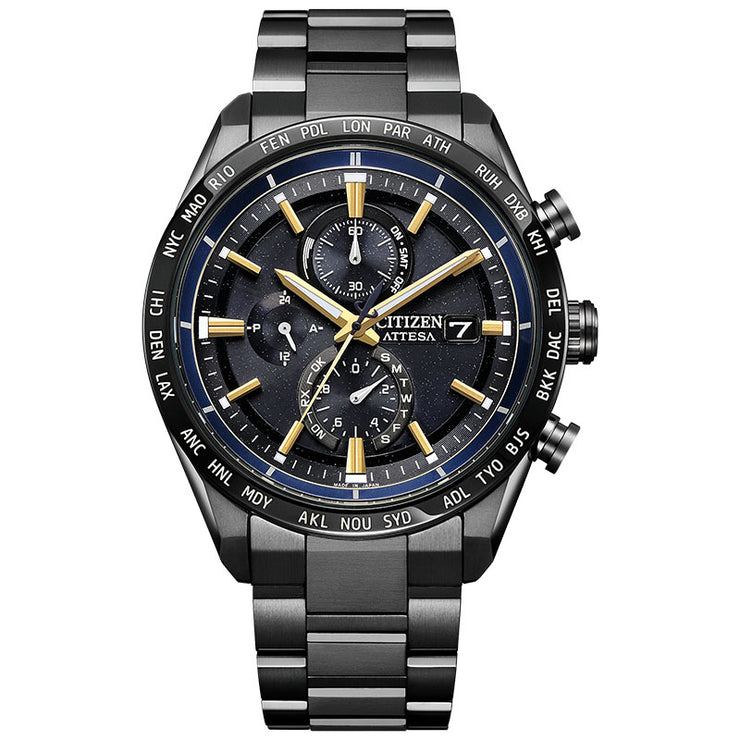 チタニウムで次世代を進み続ける、シチズン ATTESA(アテッサ)。 JAXAの新型宇宙ステーション補給機「HTV-X」をイメージした限定モデル。 「HTV-X」のボディに着想を得た個性的なカラーリング、 ラメのきらめきを生かしたブラックの文字板が宇宙を彷彿とさせます。 ・微細なラメがきらめくブラックの文字板が、宇宙空間を表現。「HTV-X」のボディカラーに着想を得た イエローゴールドの針とインデックスが、堂々とした存在感を放ちます。 ・文字板を囲むインジケーターリングには、「HTV-X」が羽のように伸ばすソーラーセルをイメージした 深いブルーを採用しています。 ・裏ぶたには「HTV-X」のミッションマークを刻印しています。