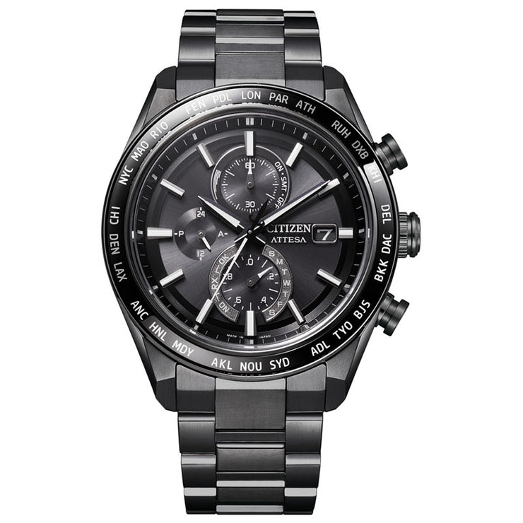 チタニウムで次世代を進み続ける、シチズン ATTESA(アテッサ)。 人気の「ACT Line」AT818シリーズをベースにアップグレード。 ベゼルにリング状のサファイアを埋め込み、 美しい艶と輝きを宿したワンランク上の1本です。 ・スーツスタイルとカジュアルの両方にフィットする、力強く軽快なデザイン。 ベゼルはGPS搭載モデルで人気のサファイアガラスリングを搭載した高級仕様です。 ・モノトーンでまとめたシックなデザインで視認性を確保しました。 ・サファイアベゼルの上にシルバー蒸着で仕上げた都市名表示が輝きます。