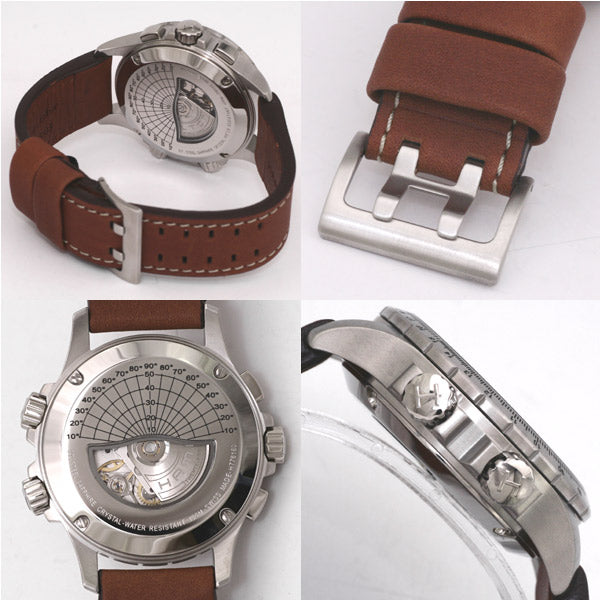 ハミルトンの最高峰モデル、カーキ・Xウィンド。航行に必要な、偏角計算機能を初めて腕時計に組み込んだナビゲーションウォッチ。この機能は、ベゼルとクロノディスクにより、飛行時に遭遇する横(Xwind)を入力する事で、飛行方角と速度を算出する事が出来る様になっています。このモデルで計算出来る航行用計測機能は、風速、風向き、航空速度による『磁気偏角差』、『クロスウィンド角』、『ドリフト角』、『修正進路』となっています。非常に複雑な機構となっており、ETA7750をベースにハミルトンの最先端技術によりムーブは、厳正なチェックの元、作成されています。大きめの文字盤に、重厚なステンレスは存在感たっぷりです。美しいシースルーバックからは、かのETA社の最上級ムーブメントで複雑な機構を視認することが出来ます。X-Wind Auto Chrono