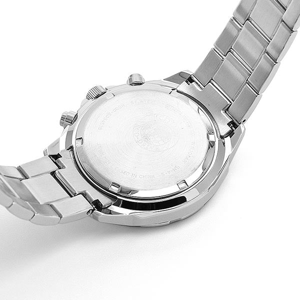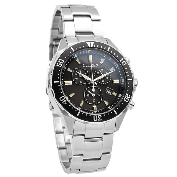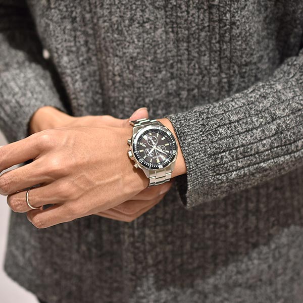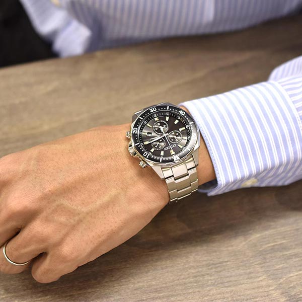 トレンドのダイバーデザインを取り入れたエコ・ドライブクロノグラフモデルが登場します。視認性に優れたベゼルデザインとインデックス。スポーティな印象を与えるクロノグラフ。エコ・ドライブ、10気圧防水、回転ベゼル、シンプルアジャスト、クロノグラフ機能(1/1秒,60分計)。
