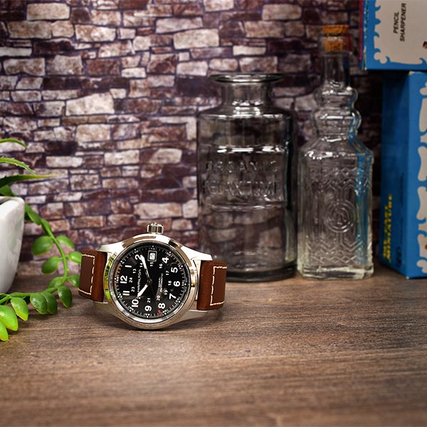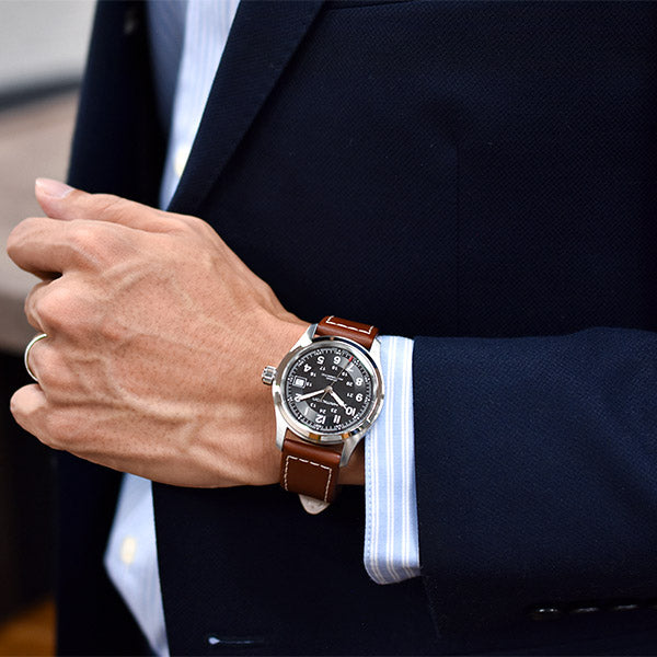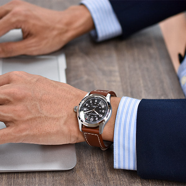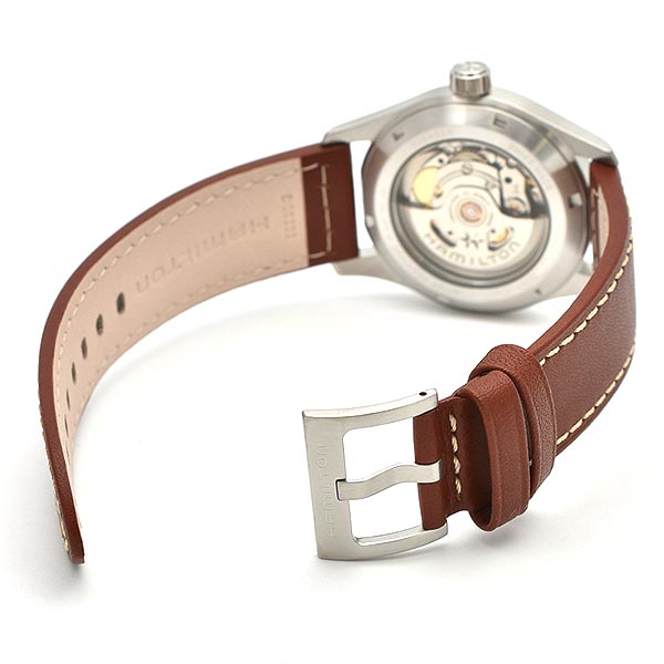 シースルーバックから覗く精緻な機械式ムーブメントが印象的。厚みのあるステッチの入ったブラウンレザーレザーにスタイリッシュを演出し、文字盤にはミリタリーウォッチの魅力が刻まれる。インデックスと指針には夜光塗料があしらわれ、暗所でもその存在感を発揮。「H」の刻印された大きなリューズをアクセントに操作性の高さも魅力。Khaki Field AUTO