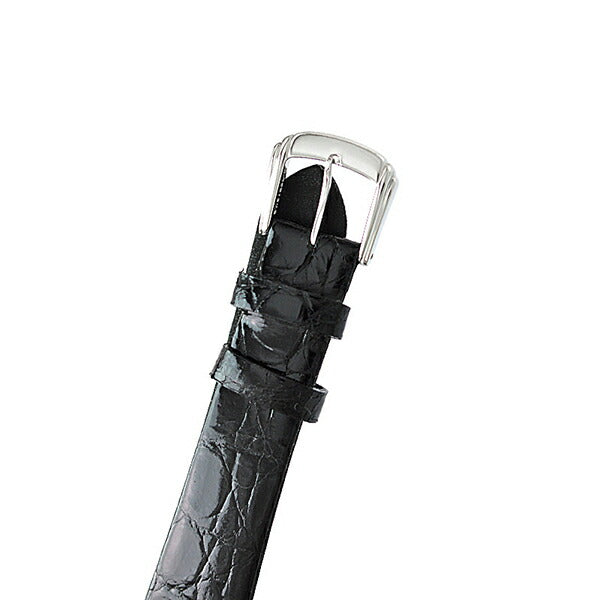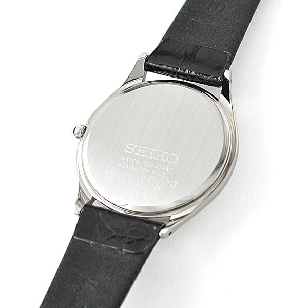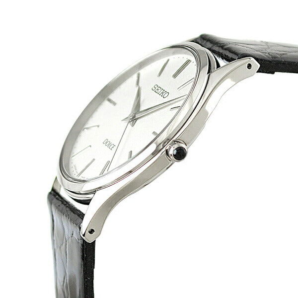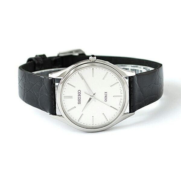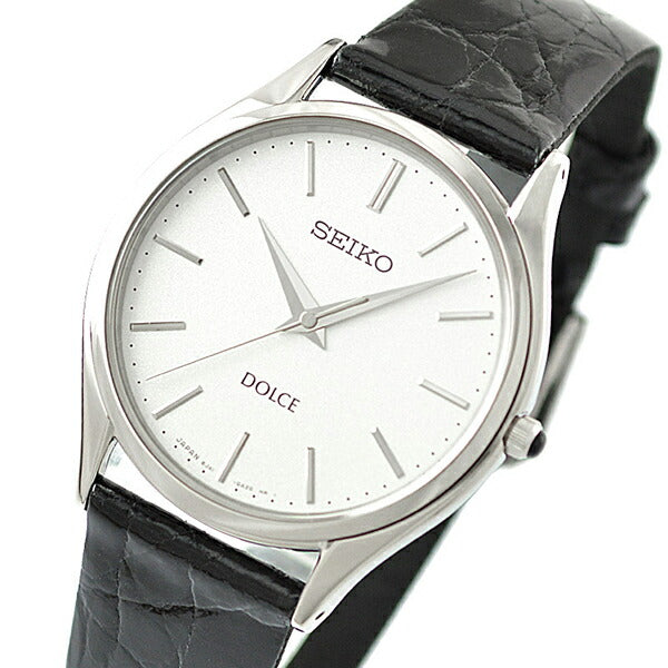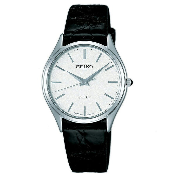 SEIKO「ドルチェ DOLCE」 シルバーのラウンド型のケースにシンプルなバーインデックスを採用。12時の位置にブランドロゴが表示されています。ベルト素材にはサイドワニを使用しています。