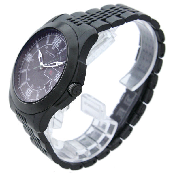 グッチの「YA126202」 ステンレス素材で統一されたラウンド型ケースとベルト。ブラックの文字盤の12時位置にはブランドロゴ、4時位置には日付表示機能を配置しています。風防にはサファイアクリスタルガラスを採用。また、中留め構造は両開き式です。