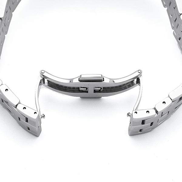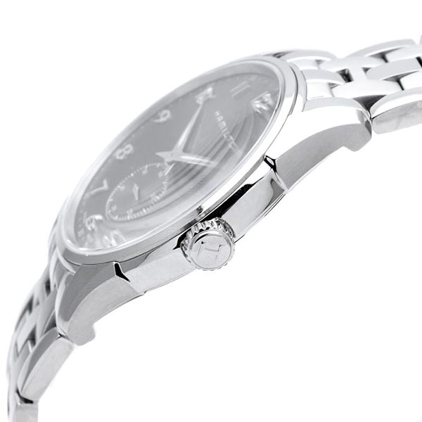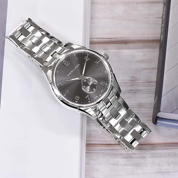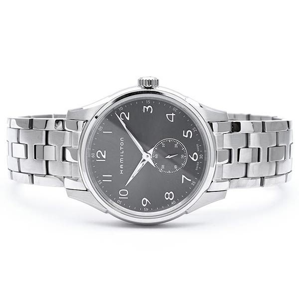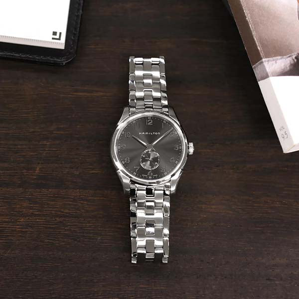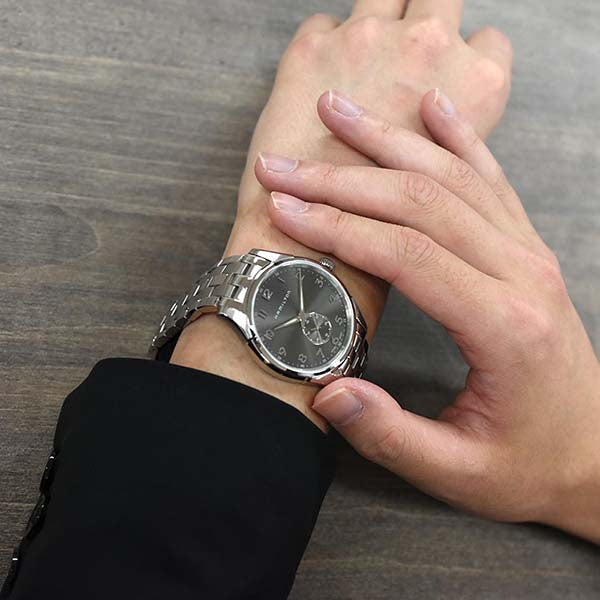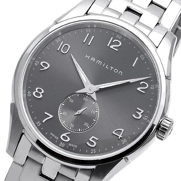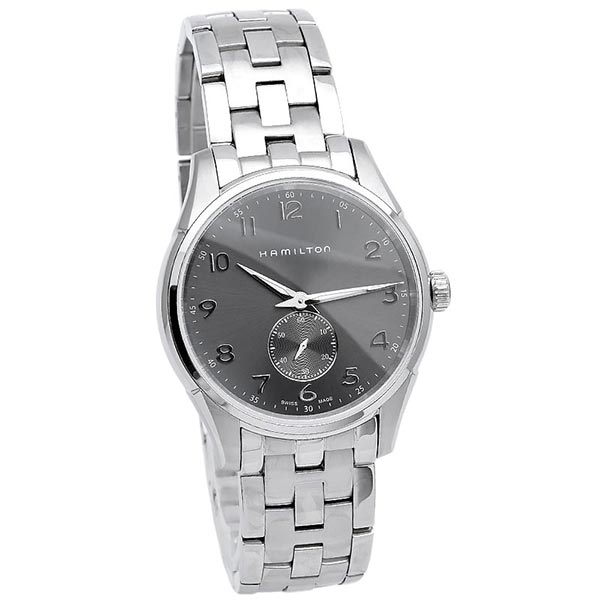 ハミルトンの「H38411183」 ハミルトンの「H38411183」 ステンレス素材で統一されたラウンド型ケースとベルト。グレーの文字盤には12時位置にブランドロゴ、6時位置にスモールセコンドを配置しています。裏蓋にはブランドロゴを刻印。また、中留め構造は両開きプッシュ式を採用しています。