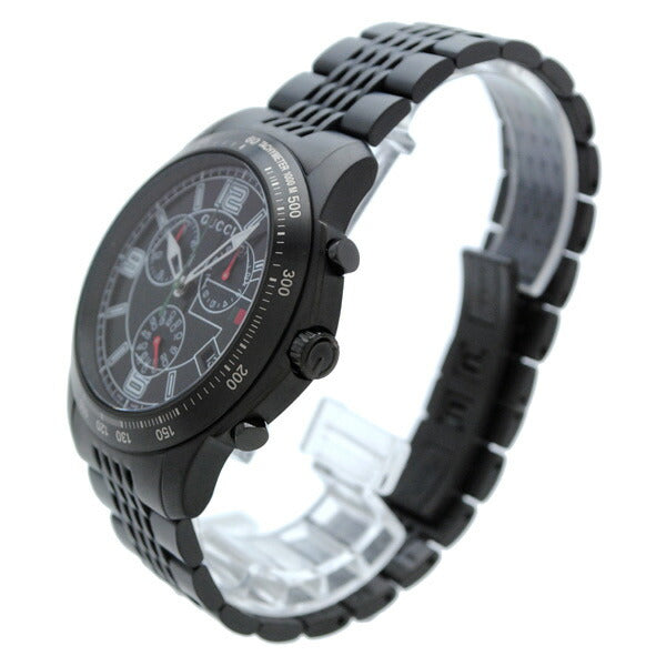 グッチの「YA126217」 ステンレス素材で統一された円形型ケースとベルト。機能としてクロノグラフ、日付表示機能等を搭載しています。インデックスはアラビア数字とバーインデックスを採用。また、中留め構造は両開き式です。