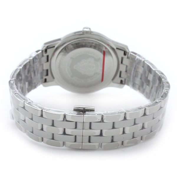 グッチの「YA055212」。ステンレス素材で統一された円形型ケースとベルト。文字盤の3時位置には日付表示機能を配置しています。インデックスにはバーインデックスを採用。また、中留め構造は両開きプッシュ式です。 | |