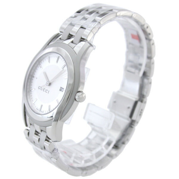 グッチの「YA055212」 ステンレス素材で統一された円形型ケースとベルト。文字盤の3時位置には日付表示機能を配置しています。インデックスにはバーインデックスを採用。また、中留め構造は両開きプッシュ式です。