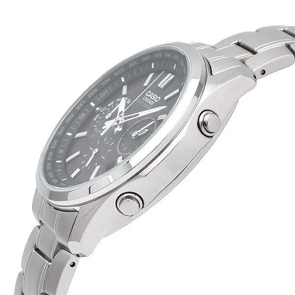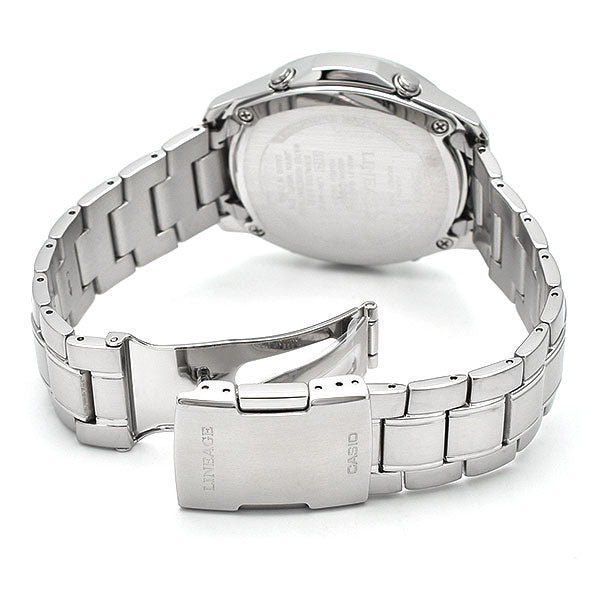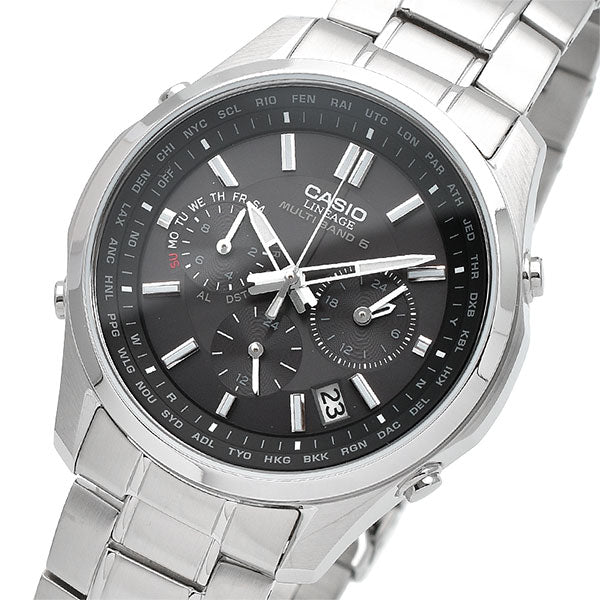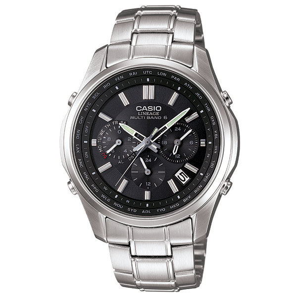 カシオの「リニエージ」 シルバーのステンレスベルトにステンレスの円形ケース。バーインデックスが採用されたブラックの文字盤。日付・曜日表示機能、ストップウオッチ、アラーム、充電量表示機能、パワーセーブ機能など搭載しています。 ※初回入荷数に限りがあるため、入荷予定が遅れる場合がございます。あらかじめご了承ください。 ※数量限定商品のため、ご予約確定順にお手配させていただきます。残念ながらすべてのお客様にご提供させていただけない可能性がございます。あらかじめご了承いただきますようお願い申し上げます。