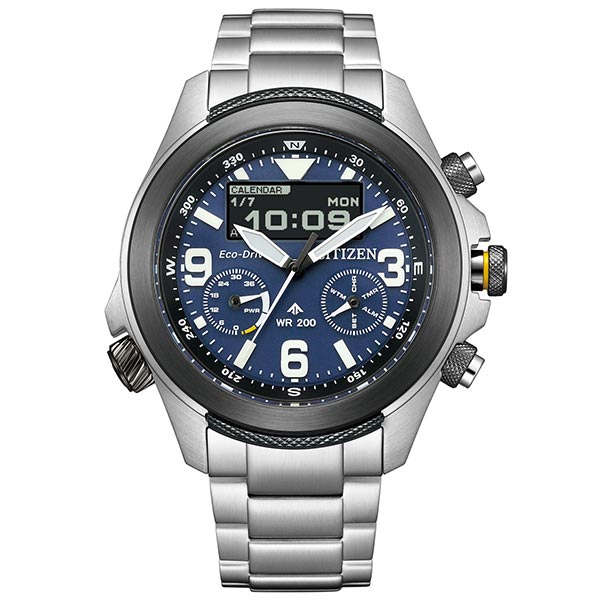 機能性、耐久性、安全性を兼ね備えた本格スポーツウオッチ、シチズン PROMASTER(プロマスター)。高解像度ディスプレイと新開発のムーブメントを搭載。アナログとデジタルの魅力を融合し、進化を遂げたLANDシリーズの新作です。新開発のムーブメント「Cal.U822」を搭載したエコ・ドライブ コンビネーションウオッチ。アナログ時計の視認性と美しさ、デジタル時計の機能性とツール感あふれるデザインを融合しています。ディスプレイには解像度の高いMIP(メモリインピクセル)液晶を採用。時刻や日付などの表示が従来よりも高精細になり、室内はもちろん屋外でも優れた視認性を発揮します。複数時刻や任意の曜日での設定が可能なアラームなど機能面もアップデート。見返しリングは回転式になっており、8時位置のりゅうずを操作することで方位計測が可能です。文字板は光の反射を抑えるマット仕上げ。太い針、アラビア数字とバーインデックスを組み合わせたメリハリのあるデザインで、アナログ表示の視認性も重視しています。耐久性の高いコーデュラバンドを合わせたカーキ色の文字板、耐久性と環境への配慮を両立したバイオマスウレタン(ベネビオール)バンドを合わせたブラックの文字板、メタルバンド仕様のブルー文字板の3タイプが登場です。