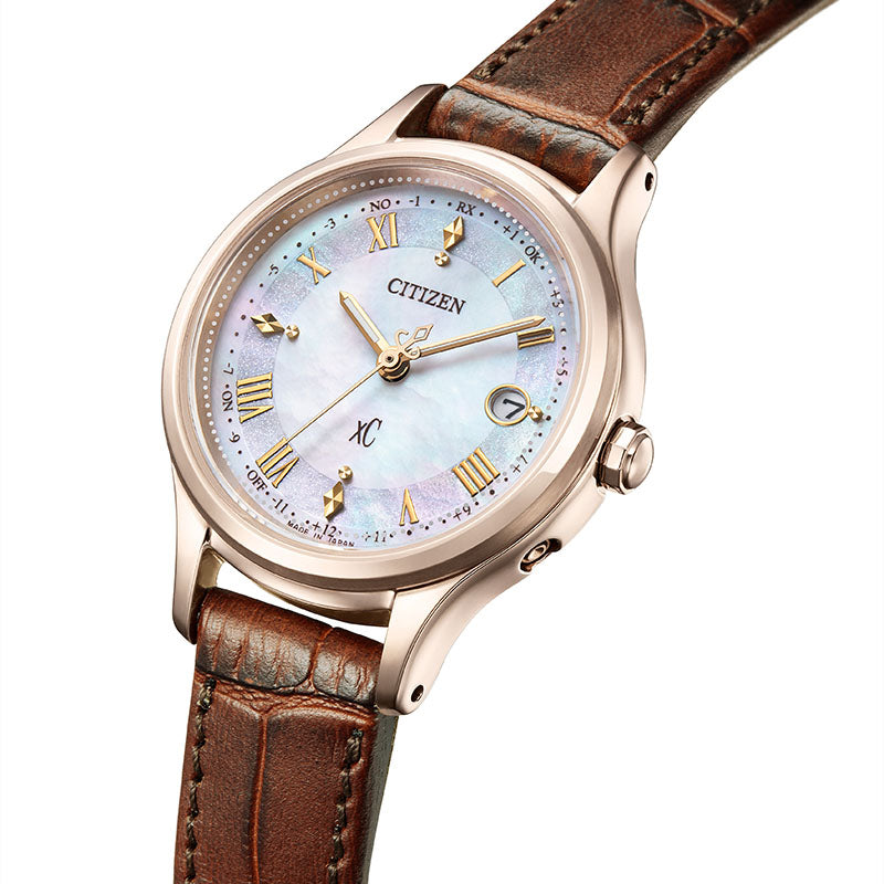 前を向く女性を応援するエンパワーウオッチブランド、 シチズン xC(クロスシー)。 サクラピンク®のケースと白蝶貝文字板の組み合わせが シンプルでありながらも、華やかな存在感を演出。 ブラウンの革バンドが手元を引き締める 「hikari collection」の新作です。 ・「hikari collection」に、サクラピンク®のケースと革バンドを組み合わせた新作が登場。シンプルな 美しさの中に、華やかな存在感が光ります。 ・「hikari collection」のポイントであるベゼル、差し込む光をイメージしたカットパーツなどの要素 はそのままに、文字板には白蝶貝を採用。上品でさりげない輝きが手元を彩ります。 ・型押しを施した牛革のバンドが、手元を大人っぽく引き締めます。
