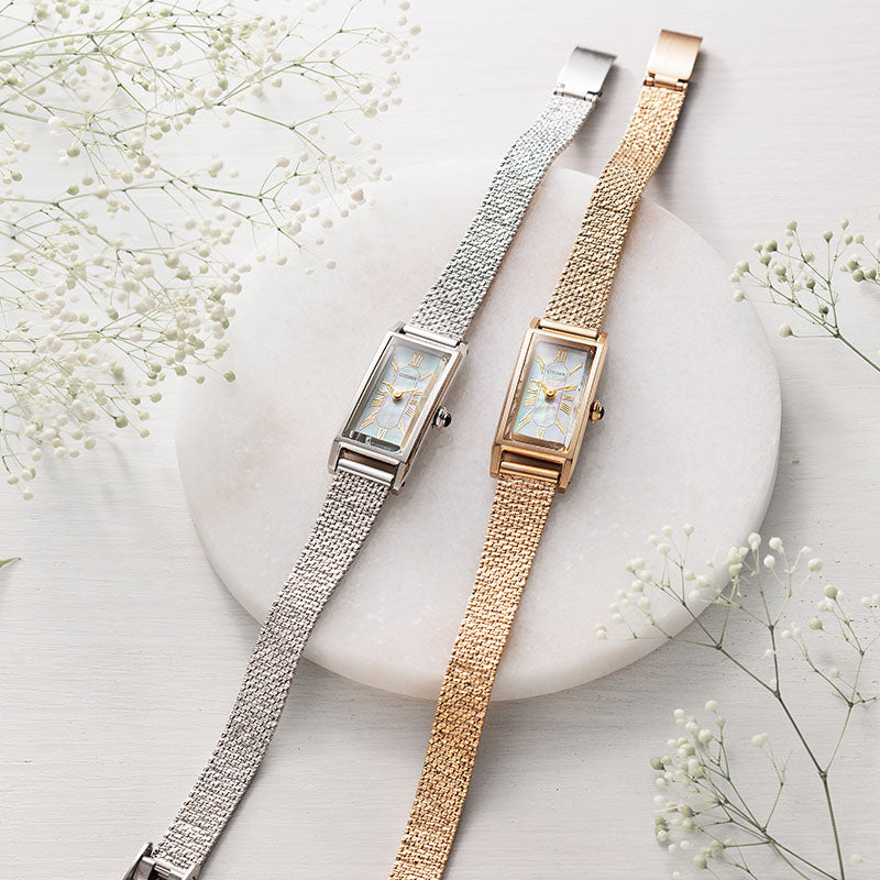 アンティークデザインのエコ・ドライブアクセサリーウオッチ、 シチズン Kii: (キー)。 人気のスクエアモデルに、2Way仕様の限定モデルが登場。 オーセンティックな表情と美しい白蝶貝が、華やかな手元を演出します。 ・華奢でありながら凜とした佇まい、スリムなケースが人気のスクエアモデルをベースに、美しい白蝶貝 文字板を合わせた限定モデルです。 ・文字板中央に、ギョーシェ彫りを思わせるパターンを施し、高級感と華やかさをきわだたせています。 ・クラシカルな印象のメッシュバンドに、付け替え可能な革バンドをセットした2Way仕様。ご自身で手 軽にバンド交換ができるインターチェンジャブル構造です。 ・シルバーケースのモデルには、手元をクールに彩るネイビーの革バンド、ウォームゴールドケースのモ デルには、どんなファッションにもマッチするブラックの革バンドをセット。メイクやファションに合 わせて印象が変えられます。