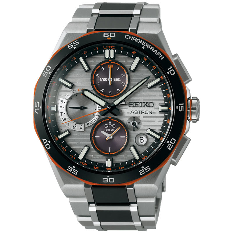 エッジの効いたカラーリングを纏ったNexter 2025 Limited Editionが登場! トレンドを意識したビビッドなネオンオレンジをアクセントカラーに採用した近未来的なカラーリング。 二体構造のベゼルは、セラミックスパーツと多角形状のアルミ飾り縁を組み合わせた、レギュラーモデルにはない特別仕様。 ダイヤルには、駆け抜ける光をイメージした質感の高い特徴的な横縞の型打ちパターンを採用。 ベゼル、ブレスレット中駒にブラックセラミックスを採用したASTRON王道のスポーティデザイン。