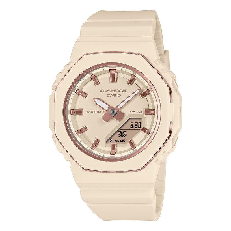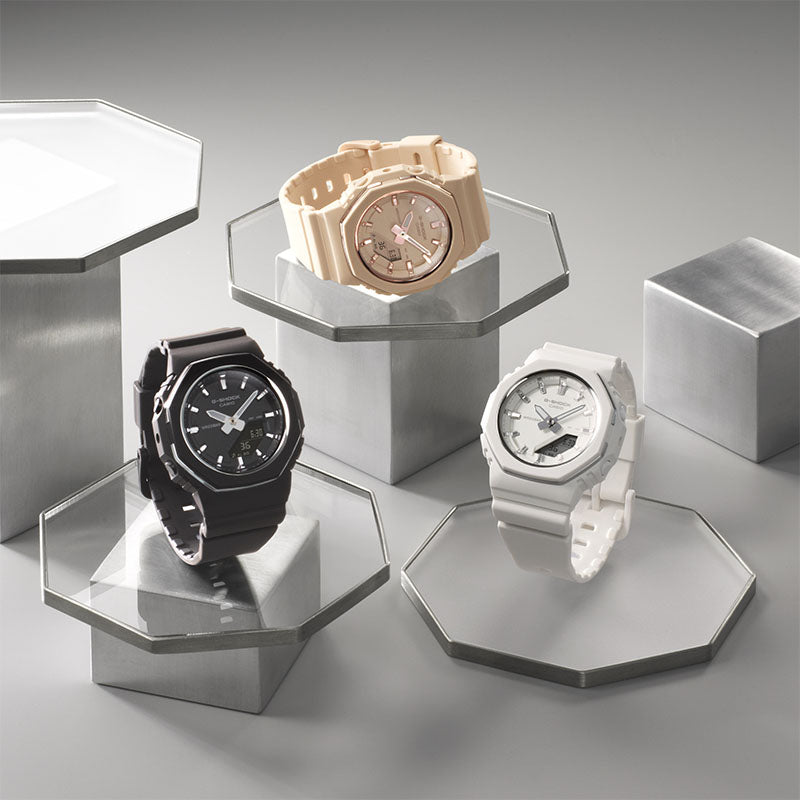 人気のアナログ・デジタルコンビネーションシリーズからベゼルの内側と外側からのぞくメタリックリングが印象的なモデルが仲間入り。GMA-P2100シリーズと同等のサイズ・装着感でありながら、メタリックパーツのさりげない輝きが高級感や洗練さを演出しています。また、ベゼル周りの文字 要素を省き、インデックスはGMA-P2100シリーズよりもシャープなデザインに変更することで、より洗練された印象を与えます。カラー展開は、ブラック、ベージュピンク、ホワイトの3色でコーディネートに取り入れやすいカラーを用意しました。ぜひクリーンで大人なストリートスタイルを彩るワンポイントアクセントとしてご活用ください。※ベゼル、バンドの主な樹脂パーツにバイオマスプラスチックを使用。原料に再生可能な有機資源を使用し、環境負荷低減への貢献が期待されています。