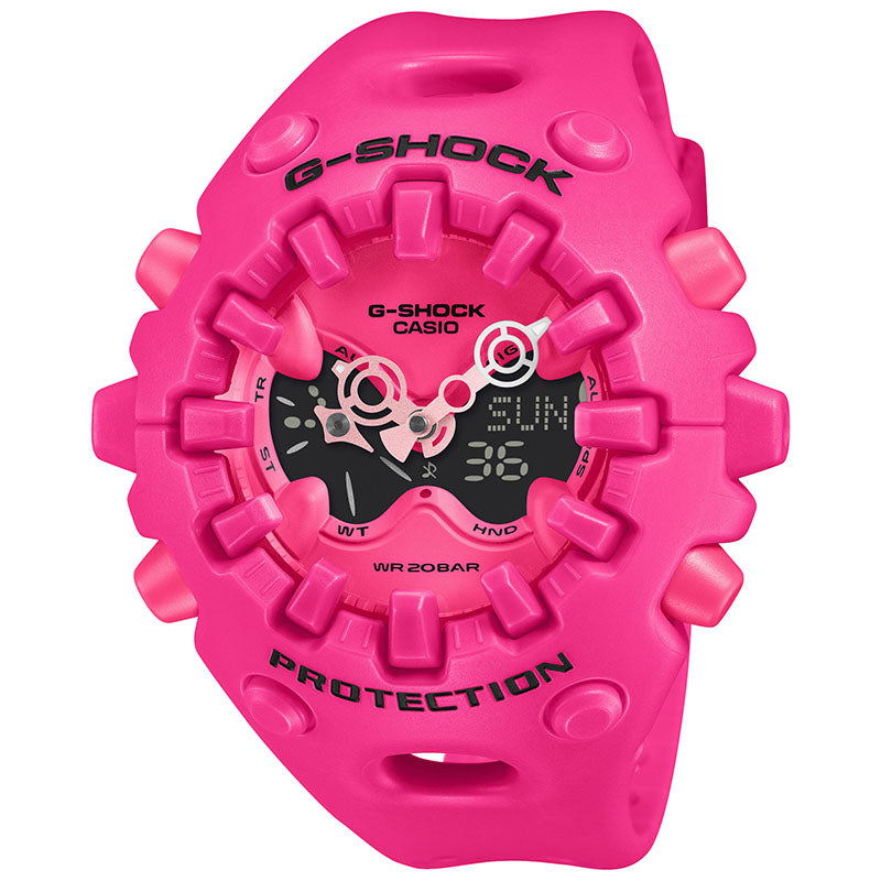 タフネスを追求し進化を続けるG-SHOCKから、構造とデザインにこだわったシリーズのご紹介です。エッジの効いたパーツを組み合わせた有機的な外装フォルムや、大型の全面液晶、さらに新開発のショックリリース針など、今までの常識を覆す斬新な発想で、G-SHOCKのアイデンティティである「強さ」を形にしています。モジュールを保護するセンターケースは、ベゼルとバンドが一体となった外装パーツでカバーされています。大型の立体インデックスをガラス上面に配置することで、衝撃を緩和するバンパーの役割も果たしています。これにより、G-SHOCK独自の耐衝撃性能を維持しつつ、ユニークで力強い外装デザインを実現しました。衝撃の影響を受けやすい針をシャフトに固定せず、磁石の力で取り付けるマグネティックホールディング構造を開発しました。この構造で取り付けたショックリリース針(分針)は、磁力で固定されているため、受けた衝撃を受け流すことができます。本構造を採用することで、針の大型化やデザインの自由度を上げることが可能になりました。※磁力で固定される構造のため、衝撃や振動で分針が揺れることがあります。また、衝撃や振動が加わった直後、および強い磁気にさらされた際は、一時的に分針がずれる場合がありますが、数分以内に正しい位置に戻ります。アナログ・デジタルコンビネーションタイプのフェイスには、オープンワーク(透かしの部分を作る技法)を施したダイアルとフルスクリーンLCDのレイヤー構造を採用しています。センターには異形タイプの時分針、液晶内には小針を配置し、斬新なデザインに仕上げています。今回新たにマットな質感が印象的なゴールド、カラフルでポップなピンクとホワイトの3色がラインアップに加わりました。大容量電池の採用と低消費電力化により、アラームやライトなどの機能を搭載しながら、約10年の電池寿命を実現したモデルです。