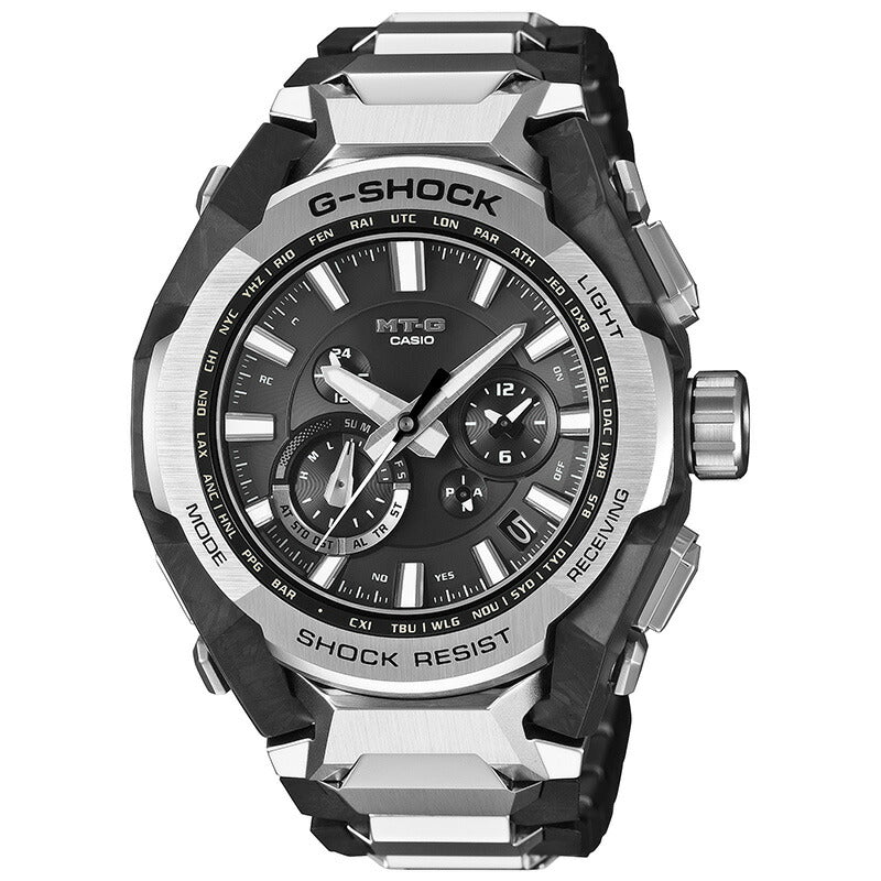 G-SHOCKの起源である樹脂素材とメタル素材を融合して、革新的な構造美を追求するMT-Gシリーズ。MTG-B4000Dは、蓄積された耐衝撃データを活用したAIによって開発された、カーボンとステンレススチールの異素材融合フレームを採用したデュアルコアガード構造のモデルです。AIと人の共創により、素材、構造、造形が有機的に結合し、独創的な機能美を追求しています。AIを活用した開発プロセスでは、デザイナーのベース案の解析・シミュレーションの最適化をAIが行い、これを相互補完的に繰り返すことで機能性と美しさを両立させた形状を実現しました。カーボン積層フレームは、シート状のカーボンとグラスファイバーを積層した母材を立体状に削り出し、複雑造形のフレームを成形。ベゼルのステンレススチールパーツは内側と外側で2体ベゼルを採用。ヘアライン仕上げとミラー仕上げで部位ごとに磨き分け、美しく仕上げました。バンドは、ステンレススチールとカーボンファイバー強化樹脂を組み合わせたレイヤーコンポジットバンドを採用。メタルの堅牢さと樹脂の軽やかさが融合し、重厚感のあるデザインでありながら、装着感の良さを実現しています。耐衝撃構造、耐遠心重力性能、耐振動構造をもつTRIPLE G RESISTも実現。裏蓋は、粉末状の金属を射出成形するMIM(メタルインジェクションモールディング )成形により立体的に成形され、ケースを保護しています。また、透明度の高いサファイアガラスを採用し、ダイアルにはカシオ山形工場の微細加工技術を駆使した繊細なデザインのパーツを取り入れるなど、細部にまでこだわりました。機能面ではBluetooth®通信機能により専用アプリ「CASIO WATCHES」と接続し時刻情報を取得。マルチバンド6やタフソーラー、高輝度なLEDライトも搭載し、実用的な機能を備えています。