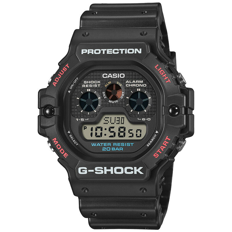 G-SHOCK初期のデジタルベーシックモデルで、従来の液晶搭載モデルと比べ斬新な3つのデジタルグラフィックを搭載し、まず海外で発売され世界的に人気を博し、逆輸入で日本でもブレイクしたDW-5900C。そんなDW-5900Cの発売当初のデザインを文字板表記の色に至るまで忠実に再現しました。また、基本スペックであるストップウオッチ、タイマーに加え、高輝度なLEDバックライト、電池寿命約10年のロングライフスペックなど実用的な機能を備えています。