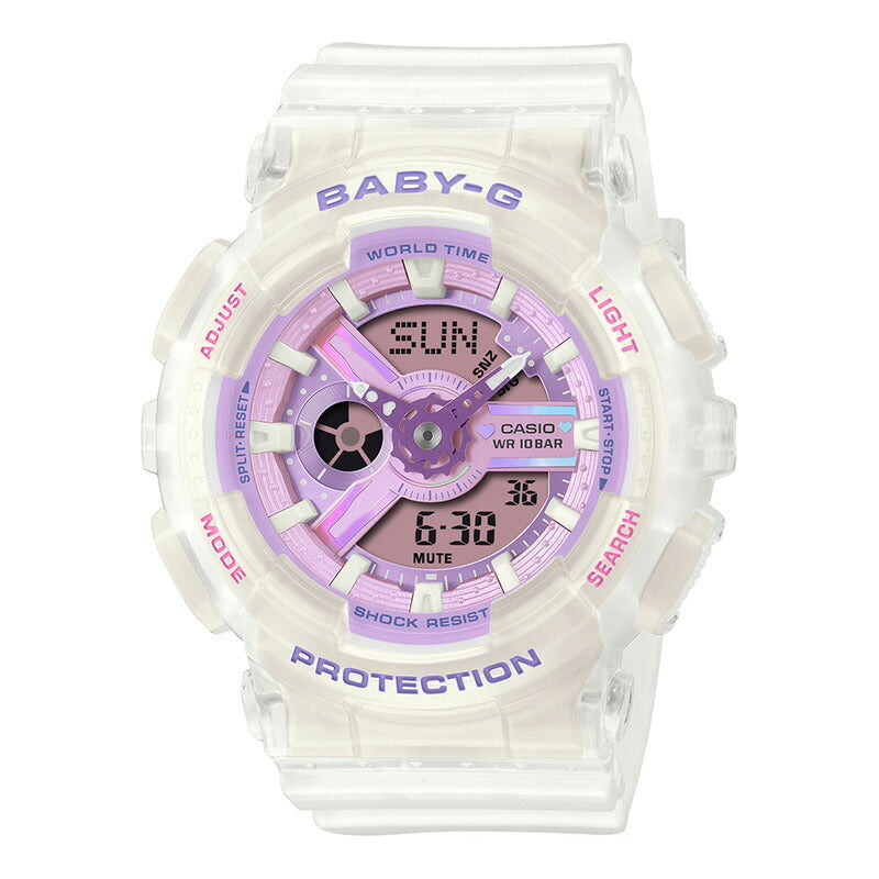 アクティブな女性に向けた耐衝撃・カジュアルウオッチBABY-Gから、柔らかなパステルカラーを纏ったデザインで、日常に彩りを添えるモデルです。ベースモデルには、文字板やインデックスなど様々なパーツを複雑に組み合わせたデザインが特徴のBA-110を採用。時計全体に光を反射してキラキラと輝く偏光塗装を施し、ドリーミーな雰囲気を演出。文字板内部には、ハート型のメタリックパーツ(3時位置)をあしらい、キュートなデザインに仕上げました。耐衝撃構造や10気圧防水機能など、日常のアクティブシーンに欠かせない頼れる機能も充実。日常生活はもちろん、スポーツやレジャーシーンも安心。アクティブな毎日を応援します。