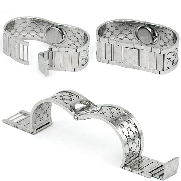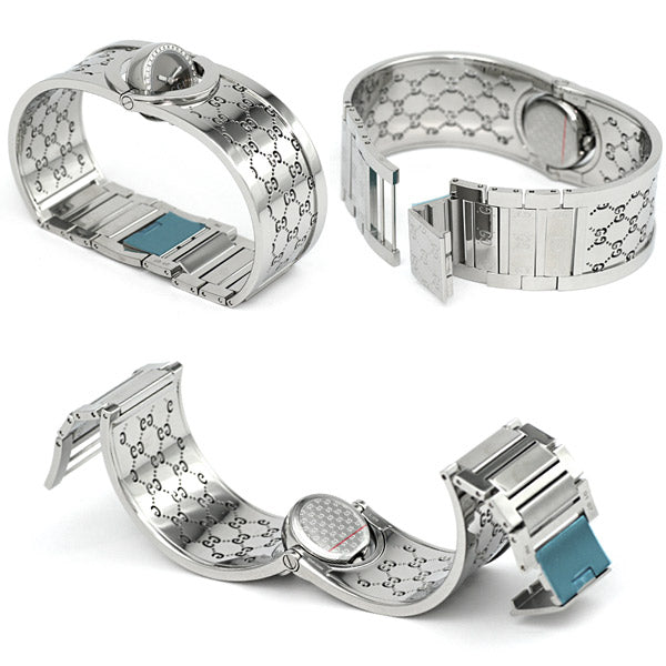 小ぶりのフェイスはバングルの中にちょこんと収まっていてとってもキュート。光沢のあるブラウンの文字盤はバングルとの相性もピッタリ。くるりと回せばフェイスが内側に隠れてさらに細かくデザインされたGマークが顔を出します。幅広のリストバンドのようなバングルにはGマークを幾つも描いています。ロゴのかかれた留め具を外すと大きく開いて着脱が簡単に出来ます。GUCCIのロゴがびっしりと刻印されたデザインがなんとも贅沢でゴージャスです。裏のケース部分にGUCCIの文字とシリアルナンバーが刻印されています。