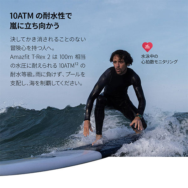 頑丈なGPSアウトドアスマートウォッチ。あらゆる面から追求したスーパータフネス。Amazfit T-Rex 2は15種類1のMIL規格に準拠するテストをクリアしています。スマートウォッチが苦手とする高湿度の環境、氷点下などの過酷な環境にも耐えうる頑丈さ。スリルを求める人にふさわしいスマートウォッチです。