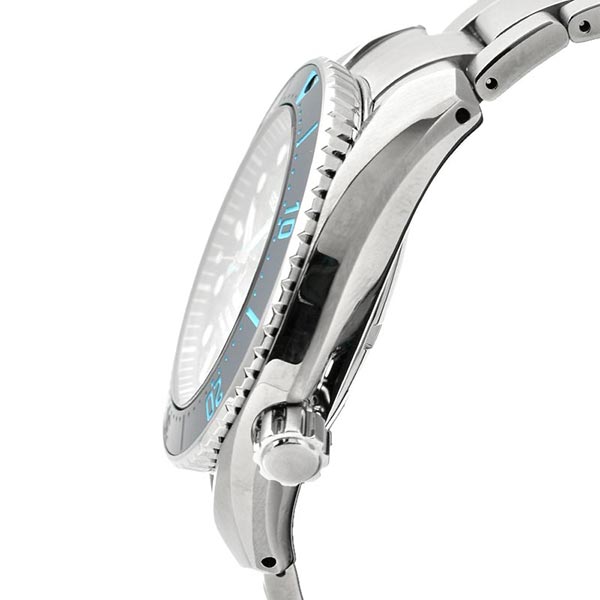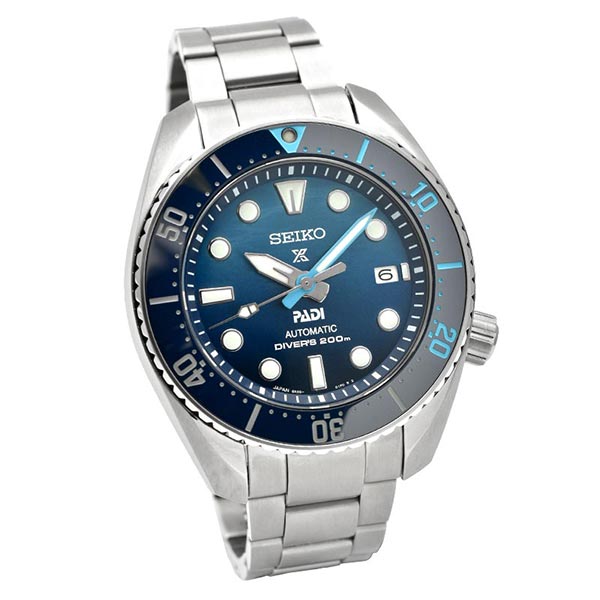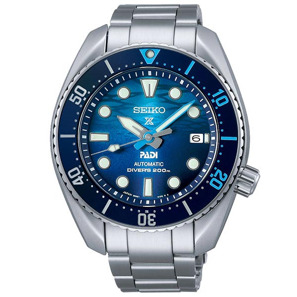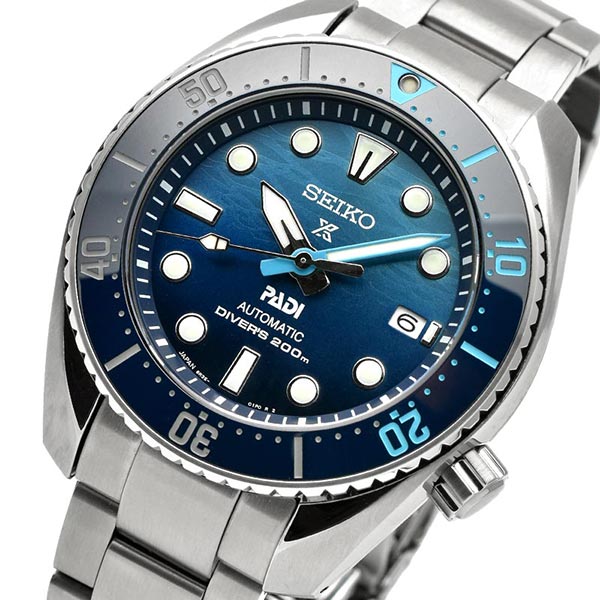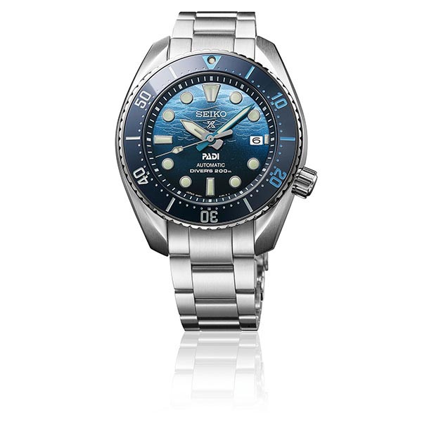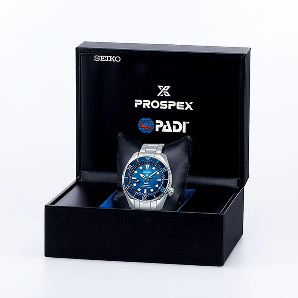 PROSPEXとPADIのパートナーシップを象徴する、新たなコンピレーションシリーズが登場。たしかな性能をもつPROSPEXのダイバーズウオッチに、PADIの信頼感と美しい海の景色を表現。海中から見上げた、降り注ぐ光と水面の揺らぎをモチーフとしたオリジナルの美しいグラデーションダイヤルが特徴。水中での視認性が高いライトブルーを分針とベゼル表示板に施した特別仕様となっております。
