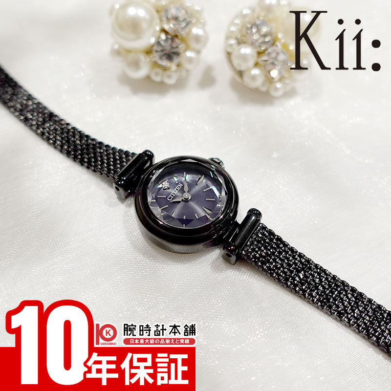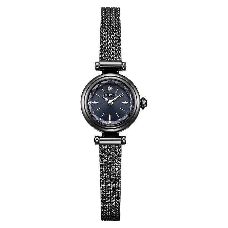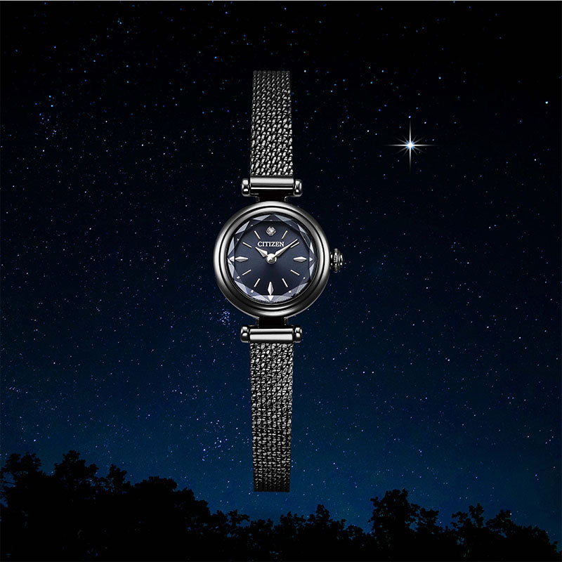 アンティークデザインのエコ・ドライブアクセサリーウオッチ、 シチズン Kii:( キー)。 神秘的な夜空の星をテーマに、ブラックを基調とした特別なラウンドモデル が登場。 自分へのお守りとして、また大切な人への贈り物としても最適な1本です。 エトワールブルー[ EG7085-50L] ・ジュエリーのように煌めくラウンドメッシュモデル。ころんとした可愛いフォルムの華奢なラウンド ケース。飾りピンに見立てたパーツやメッシュバンドが、シックでアンティークなジュエリーのような 表情を演出します。 ・星の煌めきを集めた宝石箱のようなカットガラスが、キラキラと繊細に輝きます。 ・深いブルーに染まる夜空のような文字板には、12時位置に輝く星に見立てた1ポイントのダイヤモンド がアクセントとなっています。 ※フランス語で、エトワールは「星」、リアンは「紐」「絆」「結びつき」を意味します。