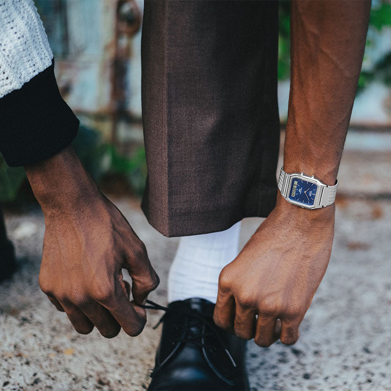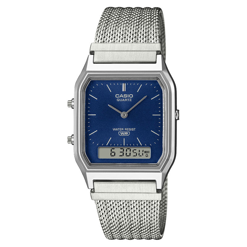 使い勝手の良さで根強い人気を誇るデジタルウオッチ、A158と、角型フェイスにアナログ時計とデジタル表示を組み合わせたAQ230を、メッシュバンド仕様に仕立てたスタイリッシュなウオッチです。メッシュバンドをベースに縦方向にプレスを入れ、立体感のあるデザインを実現しました。腕元に洗練された印象を添えつつ、快適な装着感を実現します。A158のカラーバリエーションは、シルバーケース×ダークグリーンダイアルとシルバーケース×ライトグレーダイアルの2種類。どちらもシンプルでありながら、個性的なスタイルを演出します。AQ-230のカラーバリエーションは、シルバーケース×ネイビーダイアルとシルバーケース×シルバーダイアルの2種類。クラシカルなデザインに新しいメッシュバンドが加わり、さらに魅力的なスタイルを楽しめます。編み込まれた金属の美しさが、スタイルに存在感を添えるウオッチです。