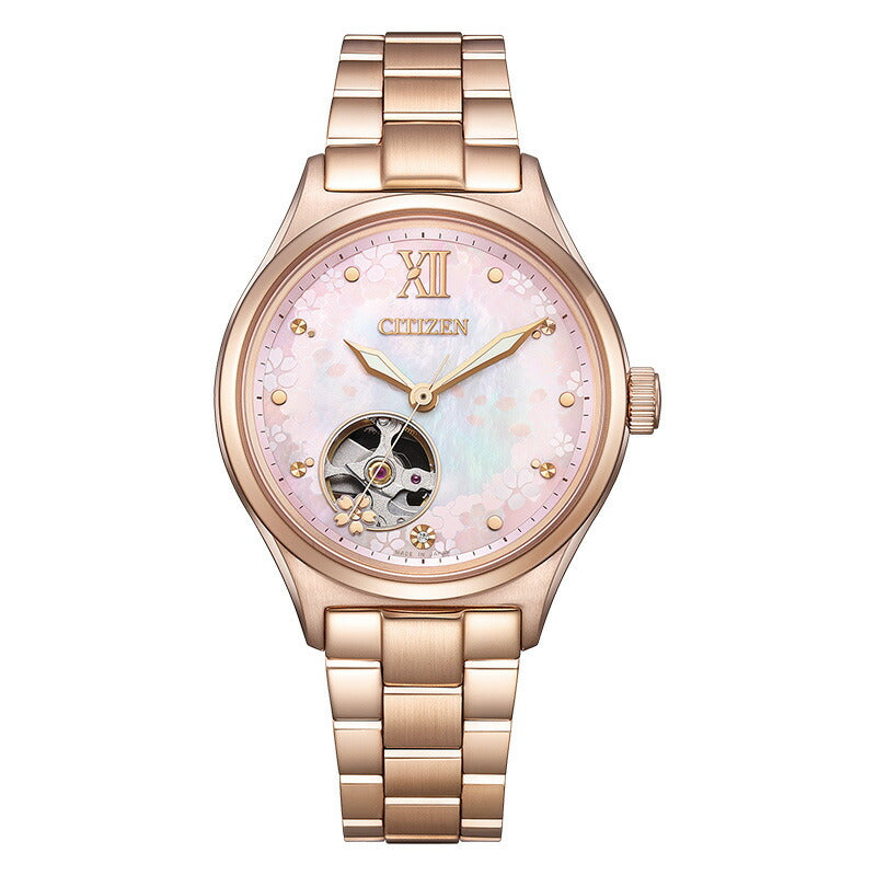 ・メカニカルウオッチならではの動きが楽しめるオープンハート仕様。PC1015-59Wは、7時の位置から覗くムーブメントに重なるように小さな桜の花をあしらいました。